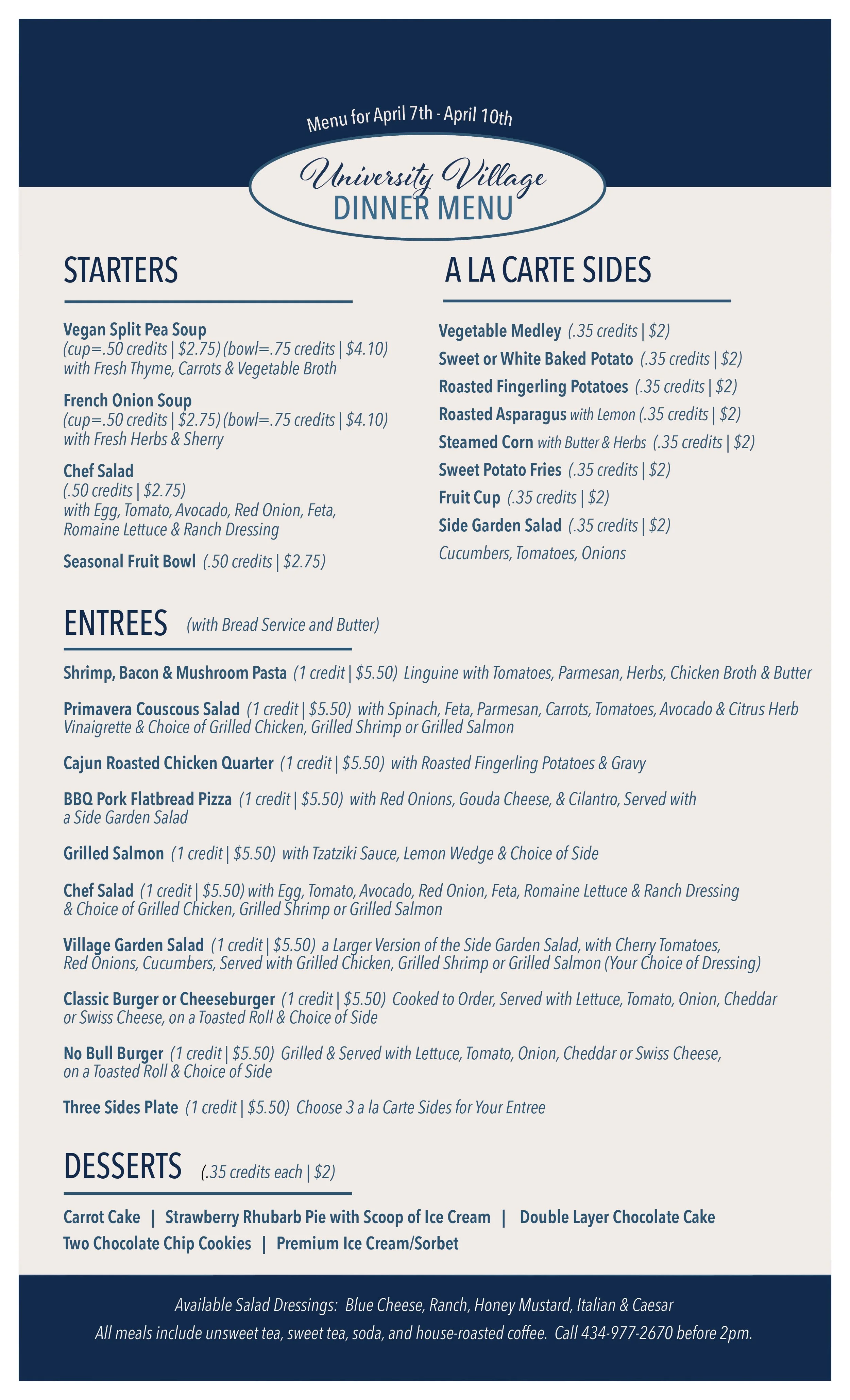 Please note, there will be no dinner service on Monday, April 6th.